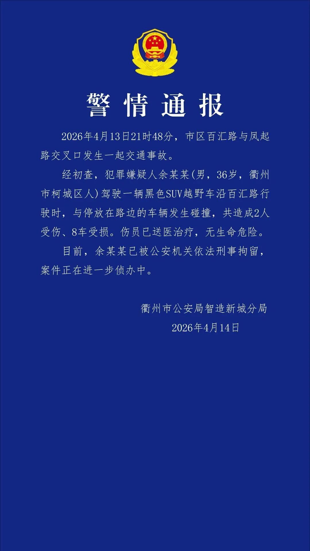 今日(4月14日),浙江衢州市公安局智造新城分局发布警情通报:2026年4月13日21时48分,市区百汇路与凤起路交叉口发生一起交通事故。